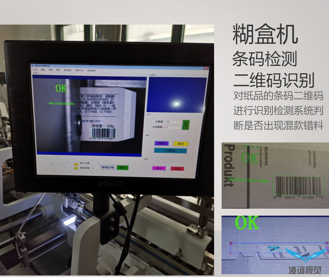 通常包裝廠生產(chǎn)的紙盒產(chǎn)品在出廠交貨前一道工序為粘盒,凌誼視覺提供的糊盒機防混貨檢測系統(tǒng)是加裝在糊盒機臺上實現(xiàn)在線檢測,防止粘盒混貨,識別條碼防呆,保障產(chǎn)品出貨品質(zhì)。該粘盒防混貨檢測系統(tǒng)基于CCD機器視覺識別技術(shù),采用高速進口工業(yè)相機設(shè)備,通過高速反應(yīng)的光電感應(yīng)觸發(fā),對每一個包裝盒子上的圖文、條碼、料號信息識別實時傳輸給由我公司自主研發(fā)的凌誼視覺檢測系統(tǒng),由視覺檢測系統(tǒng)進行數(shù)據(jù)對比校驗后判斷是否存在混貨串貨的情況,當(dāng)檢測到混貨產(chǎn)品時,系統(tǒng)實時進行聲光報警同時由停機模塊輸出停機信號控制糊盒機停機,把混貨產(chǎn)品停在相對固定的位置,方便查找和取出。